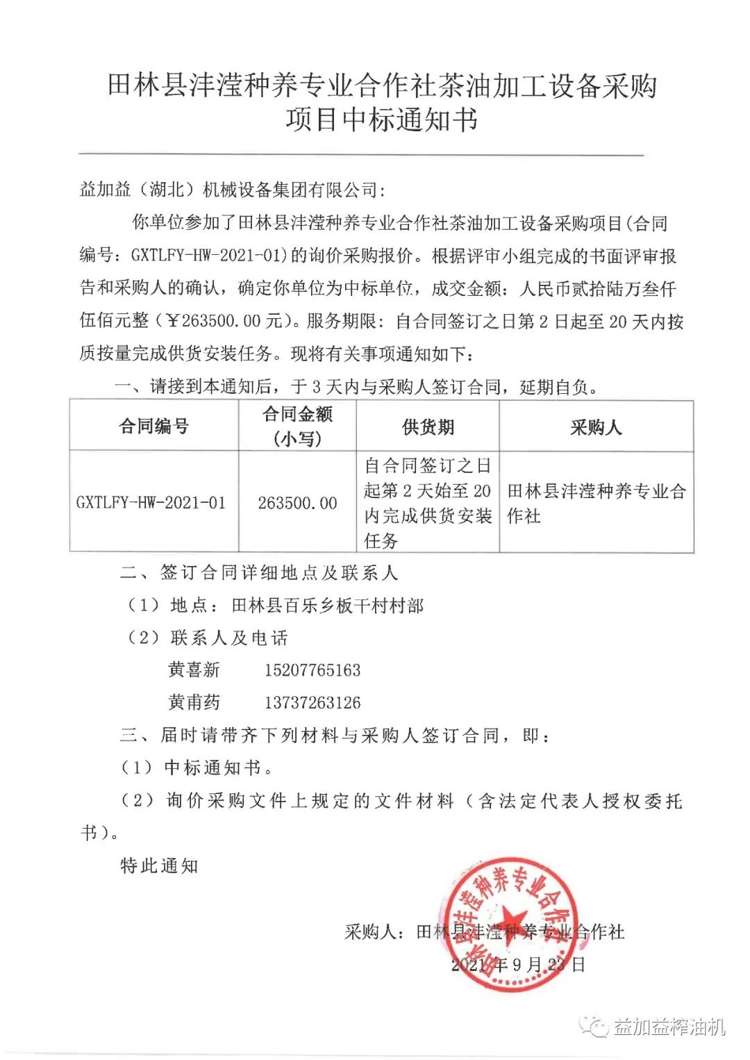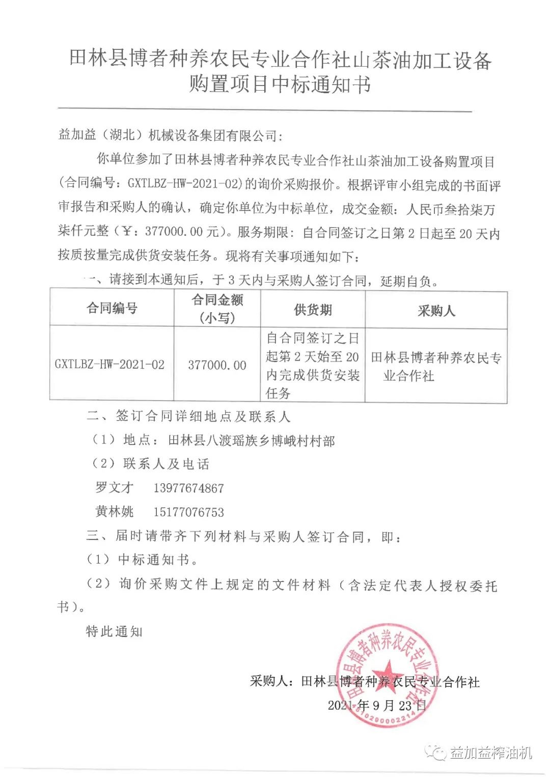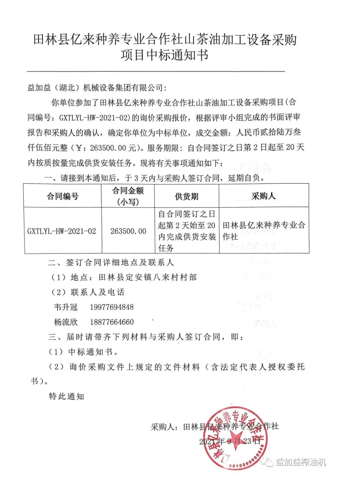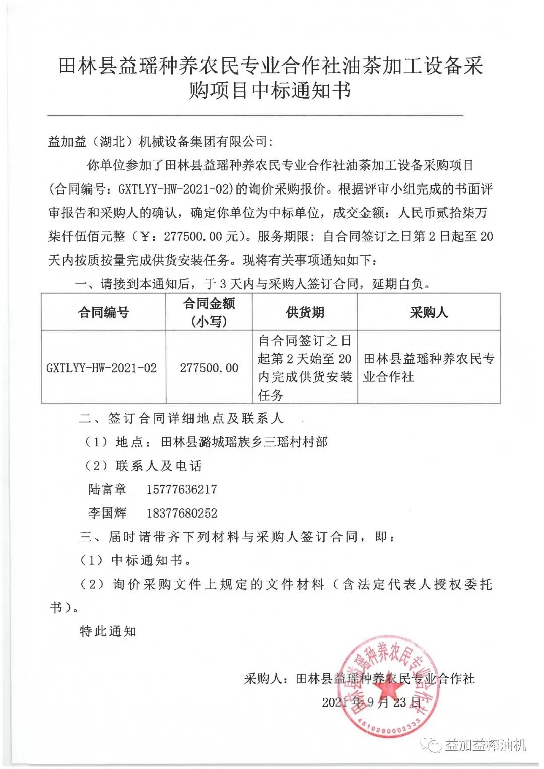 益加益集團(tuán)憑借過硬的產(chǎn)品質(zhì)量,扎實(shí)高效的工作作風(fēng),卓越的運(yùn)作團(tuán)隊(duì)和良好的企業(yè)信譽(yù),在眾多競爭對手中脫穎而出,連續(xù)中標(biāo)《中華人民共和國世界銀行貸款廣西貧困片區(qū)農(nóng)村扶貧試點(diǎn)示范項(xiàng)目》中全部11家專業(yè)合作社山茶油加工設(shè)備的招標(biāo)購置。