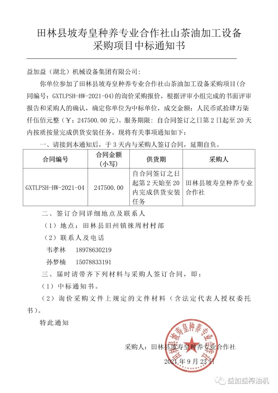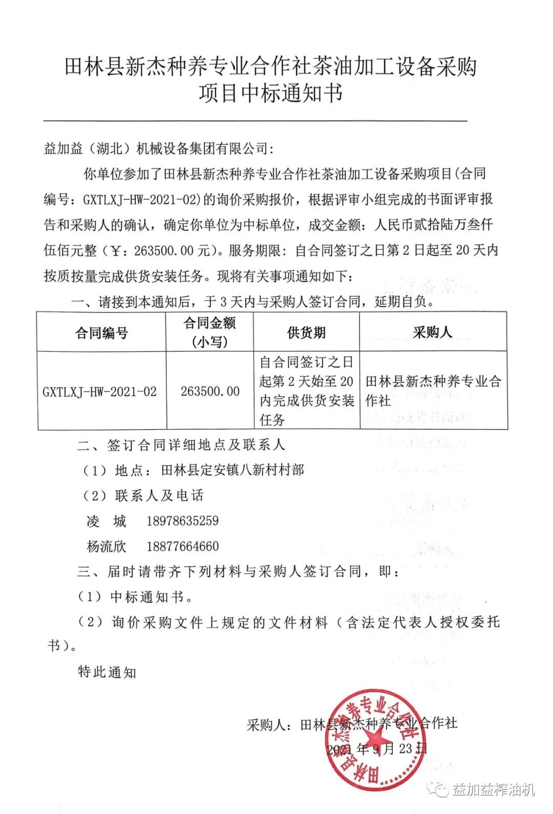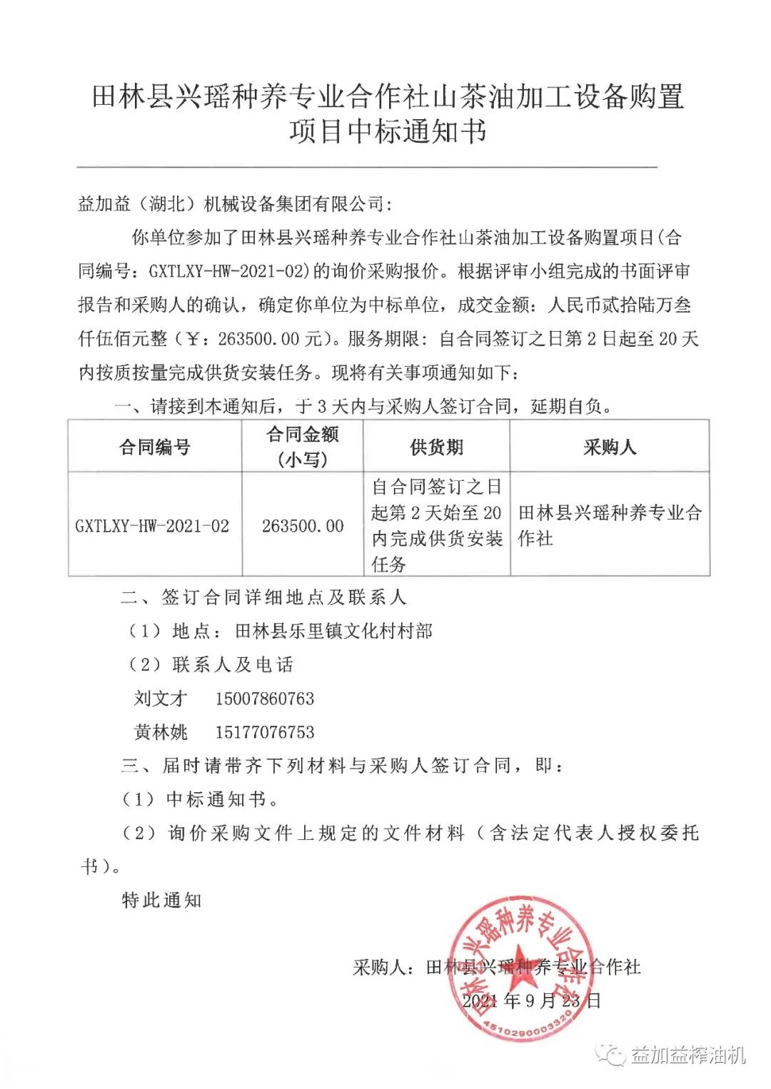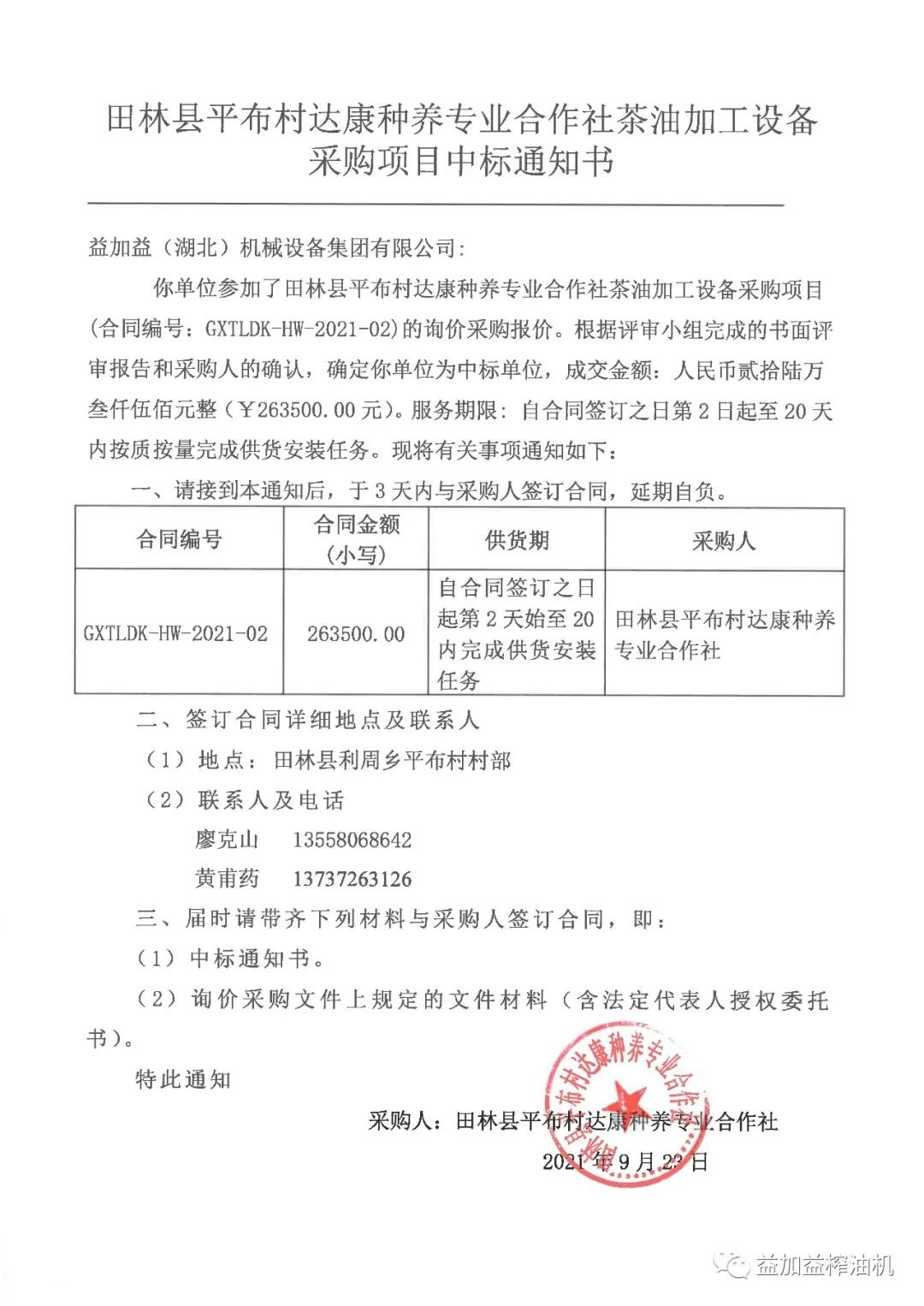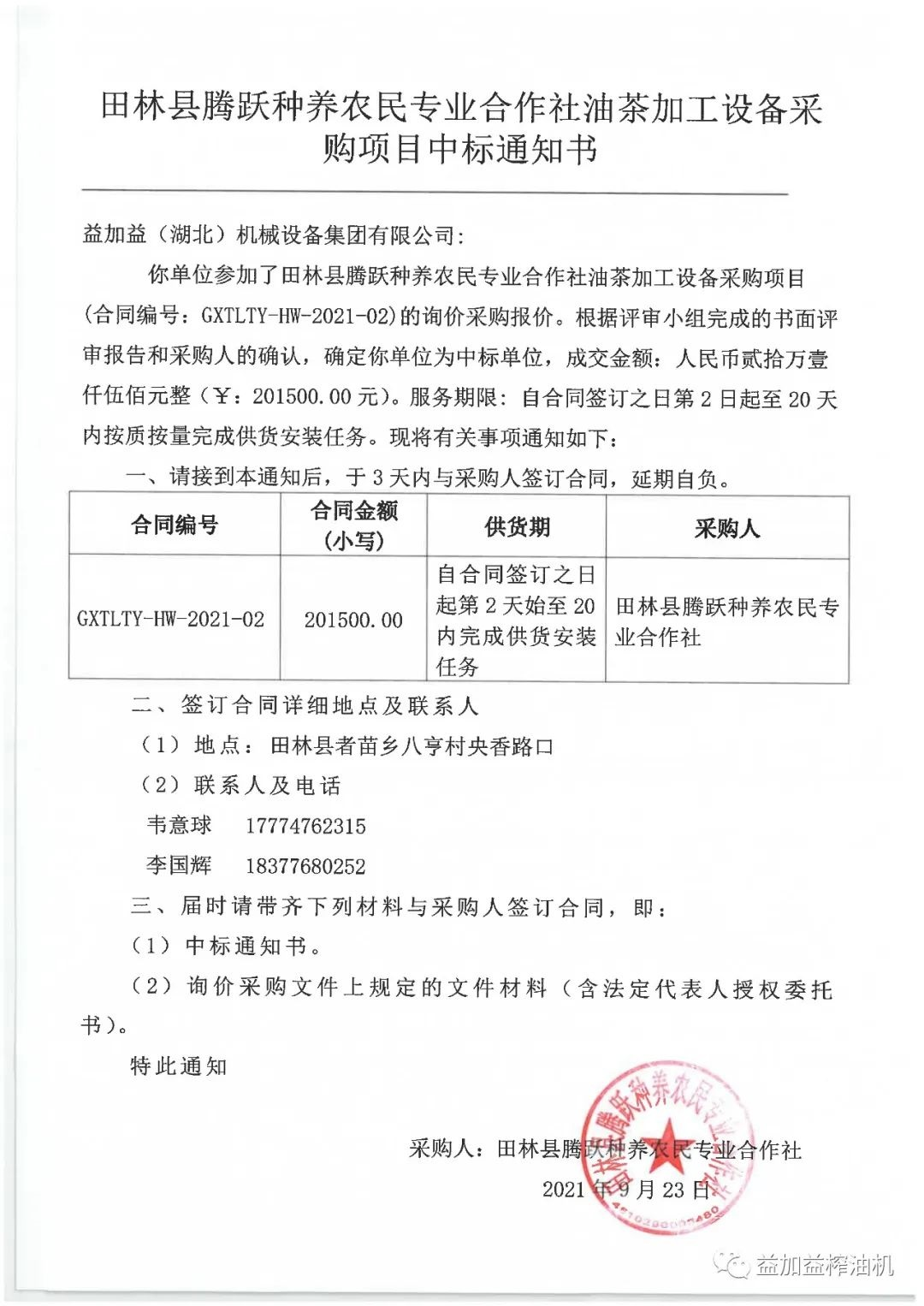 益加益集團(tuán)憑借過硬的產(chǎn)品質(zhì)量,扎實(shí)高效的工作作風(fēng),卓越的運(yùn)作團(tuán)隊(duì)和良好的企業(yè)信譽(yù),在眾多競爭對手中脫穎而出,連續(xù)中標(biāo)《中華人民共和國世界銀行貸款廣西貧困片區(qū)農(nóng)村扶貧試點(diǎn)示范項(xiàng)目》中全部11家專業(yè)合作社山茶油加工設(shè)備的招標(biāo)購置。